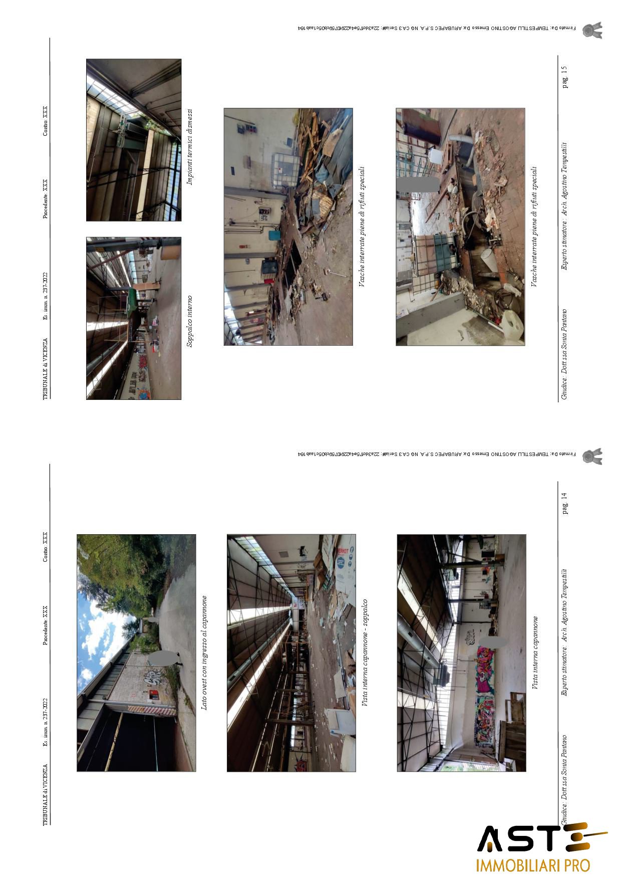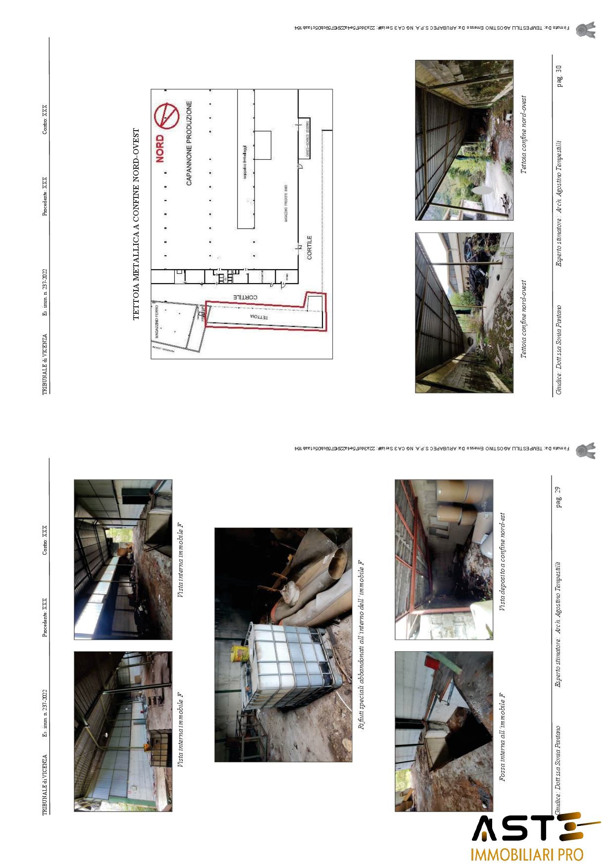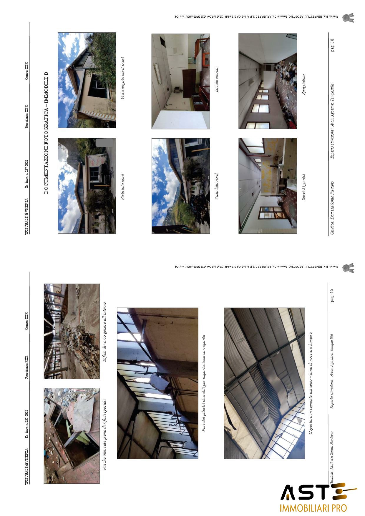 Edifici ad uso industriale con area esterna di pertinenza, siti a Valbrenta (VI) in Via Oliero di Sotto n. 42/A. Trattasi di compendio immobiliare, dismesso, costituito da: A-capannone principale, avente una superficie esterna lorda di circa mq. 4.890,00, di forma rettangolare posto al centro di tutto il complesso di immobili, B-locali di servizio: mensa, bagni, spogliatoi operai. Trattasi di porzione di immobile, avente una superficie esterna lorda di circa mq. 332, costruito in adiacenza al capannone principale lungo il lato nord. Risulta costituito da vari locali, tutti a servizio del capannone principale, quali locale mensa per gli operai, spogliatoi, bagno ed alcuni locali tecnici. Sul lato est era stata realizzata anche una cabina elettrica a servizio dell'intero complesso produttivo; C-porzione di immobile che era destinata ad uffici, costruita in adiacenza al capannone principale lungo il lato sud. Sviluppata su due piani fuori terra, al piano terra lato est è situata la stanza adibita a centrale termica, con impianti e caldaia ormai dismessa e non funzionante. La porzione in questione è costituita da vari locali, tutti adibiti ad uffici a servizio dell'attività principale; D-porzione di immobile che era destinata ad officina/magazzino, avente una superficie lorda di circa mq. 260,00, costruita in adiacenza al capannone principale lungo il lato est. Si sviluppa su un piano fuori terra con copertura ad una falda inclinata ed è costituita da due locali rettangolari, adibiti a servizio dell'attività principale; E-porzione di immobile che era destinata a deposito polveri (vernici in polvere), avente una superficie lorda di circa mq. 280,00 e costruita in adiacenza al capannone principale lungo il lato nord-est, costituita da un unico locale, adibito a deposito delle polveri che servivano per le verniciature degli elementi di produzione dell'attività principale; F-porzione di immobile che era destinata principalmente a magazzino ferro, costruita lungo il lato nord del compendio. Si sviluppa su un piano fuori terra, a forma trapezoidale, con copertura metallica a due falde inclinate. La superficie lorda degli immobili testé descritti è pari a circa mq. 500. La struttura che era adibita a canile è stata costruita in forza di licenza edilizia del 1976 e negli anni, attorno e nelle vicinanze del canile, sono state realizzate in economia e non autorizzate, diverse tettoie con strutture metalliche e lamiere.